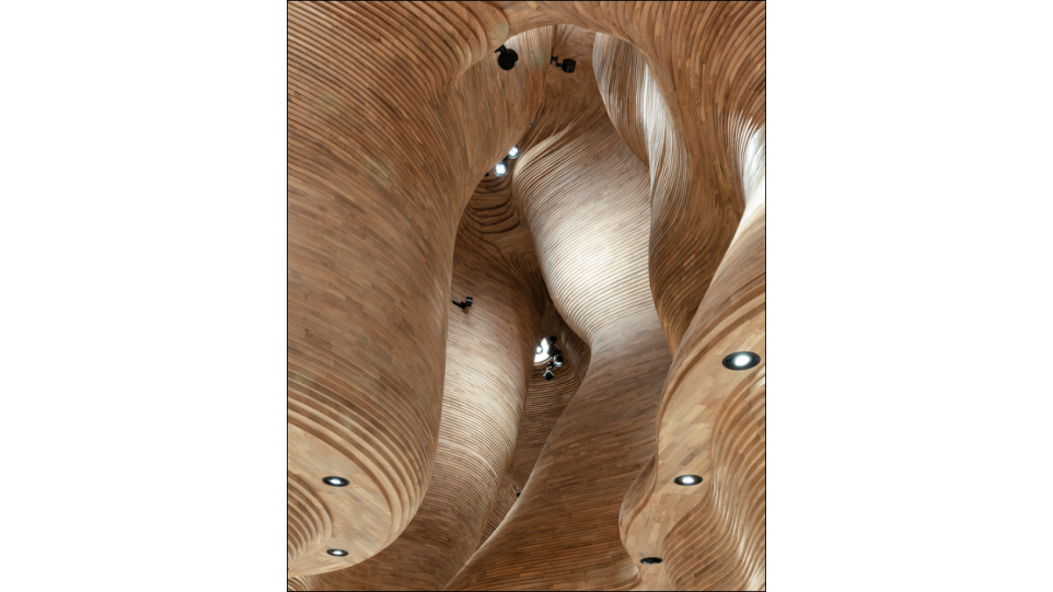 Стены торгового зала выполнены из более чем 40 тыс. деревянных панелей, выложенных причудливыми слоями.