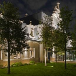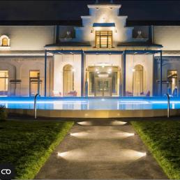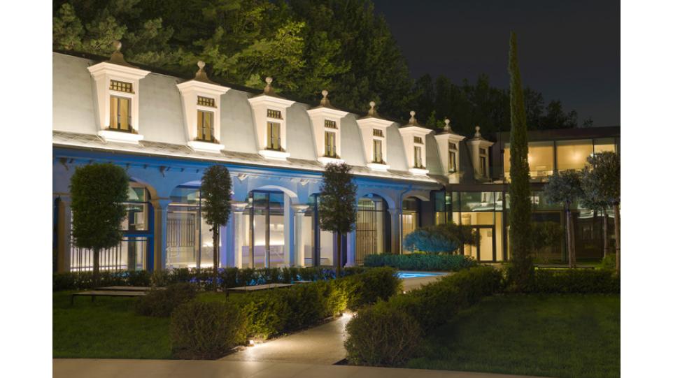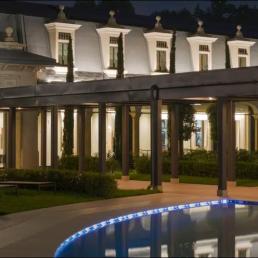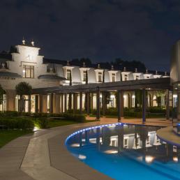 Декоративный столбик BLUM и гибкая линейная система D-WAVE с полукруглой установкой также были использованы для завершения светового ландшафта вокруг характерного круглого бассейна во дворе. Там же коллекция ALCOR помогает обозначить дорожки.