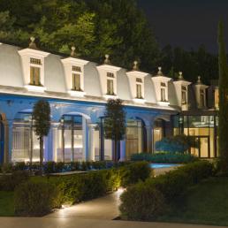 Для подсветки архитектурных фасадов использовались проекторы ARCADA, идеально подходящие для аркад и рельефов, а также настенные светильники SKIN с двусторонним излучением. Умелое использование светильников направленного света, таких как ORMA, прожекторов, таких как PERISKOP, и гибких линейных светильников, таких как RUBBER, позволило придать пространству глубину и визуальный ритм. Линейная система XENIA была выбрана для подсветки впечатляющего водопада у главного входа.