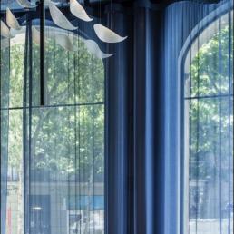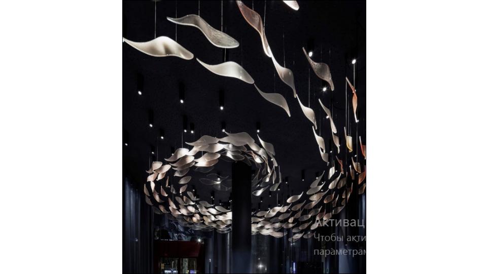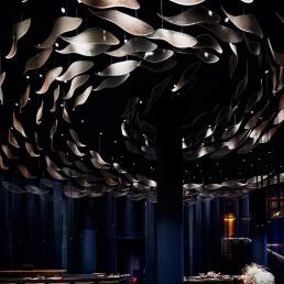На темном потолке установлено множество светильников модели iGuzzini iN 30 High Contrast. Они, будучи малозаментными, высвечивают направленным светом как колеблющиеся «лепестки», так и создают акцентирующее освещение сервировки столов..