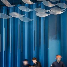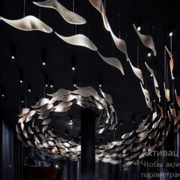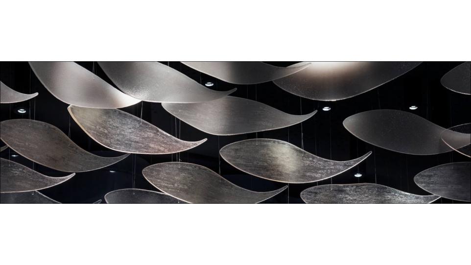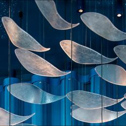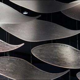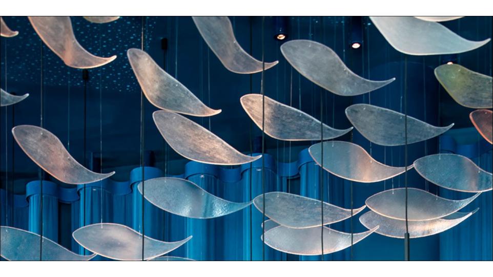 Несколько сотен изогнутых «лепестков»из бесцветного ПММА, имитирующих рыб, подвешены на тонких, почти невидимых полимерных нитях и сгруппированы в структуру, символизирующую движущийся косяк тунца в морской среде... Магический эффект движения «косяка» живых рыб поддерживается легкими колебаниями «лепестков» под влиянием движения воздуха в объеме зала.