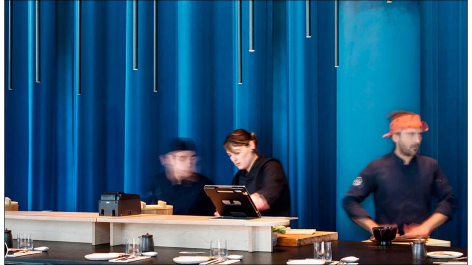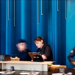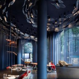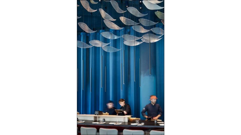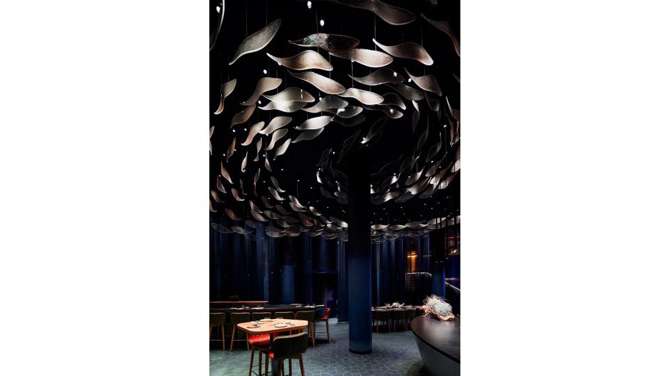 Это гастрономическое заведение, посвященное культуре выращивания голубого тунца. Концепция освещения погружает гостей в идиллическую морскую атмосферу. Три четкие сцены имитируют пространство корабля и подчёркивают центральный элемент: косяк рыб. Светодиодные светильники освещают сто «акриловых» рыб, которые вместе со светом, отражающимся от синих штор, создают образ косяка рыб в морской глубине..Каждое пространство ресторана, представляющее собой либо воду, либо корабли, спроектировано так, чтобы посетитель мог наслаждаться различными видами и взаимодействовать с окружающей средой. Совместно с дизайнерами интерьера и шеф-поварами мы стремились создать разные уровни погружения в атмосферу, сопровождаемые приглушенным, динамичным освещением, напоминающим солнечный свет, проходящий сквозь воду, или различные оттенки света на лодке, чтобы усилить гастрономические впечатления. Программирование DMX имитирует тонкую динамику, которая погружает посетителя в неявное, расслабляющее и выразительное взаимодействие с окружающей средой, создавая тем самым целостный, уникальный в своем роде гастрономический опыт.