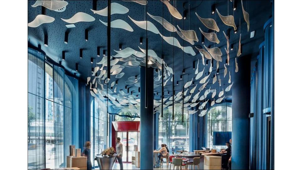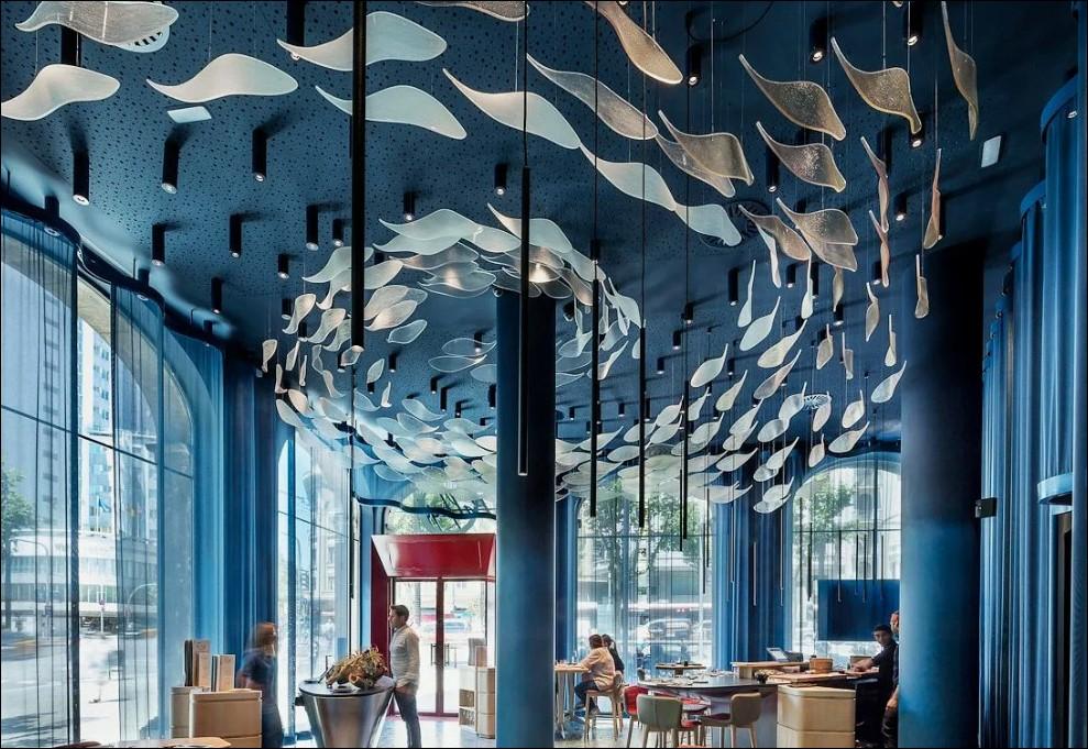 Динамическая инсталляция «Косяк рыб», служащая системой функционального и декоративного освещения, как бы погружает посетителей в водный мир обитания голубого тунца («альмадраба»).