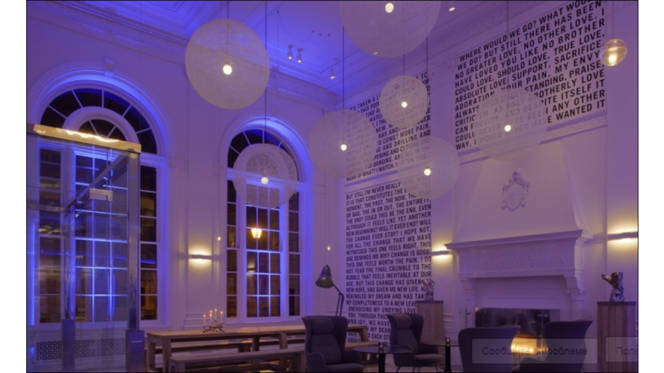 В новом лобби сразу бросаются в глаза оригинальные свисающие с потолка светильники разной формы от Mooi (Голландия) и Bocci (Канада). Привлекающий внимание гостей палас с белым текстом на черном фоне на полу у входной двери органично дополняет такие же оригинальные художественные инсталляции на обеих боковых стенах с настоящими встроенными каминами.