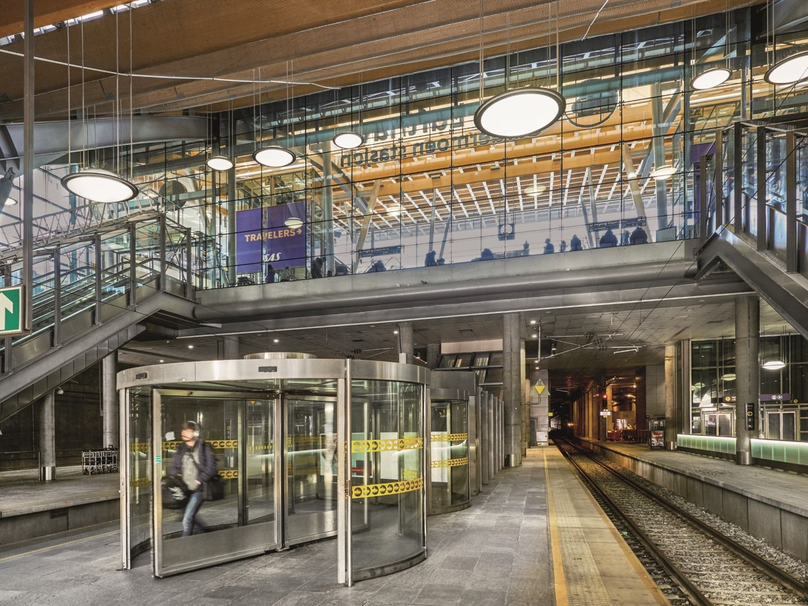 Специальные типы крупногабаритных светильников, разработанные Zumtobel для этого проекта, - «OILDRUM» и «UFO» - установлены в главном зале и в подъездном ж.д. вокзале; среди множества других типов осветительных приборов – 300 длинных непрерывных светящих рядов системы «TECTON».