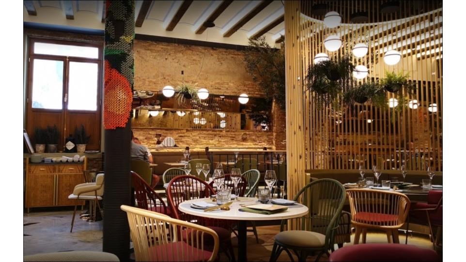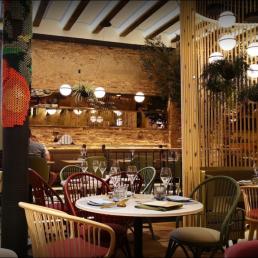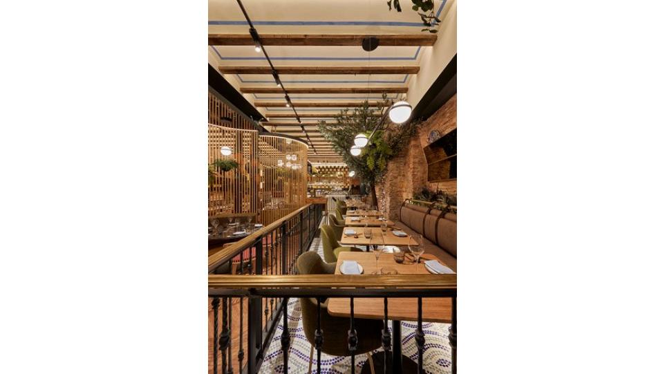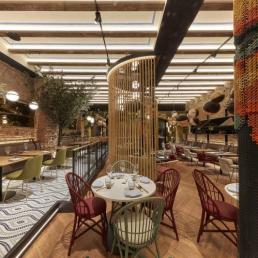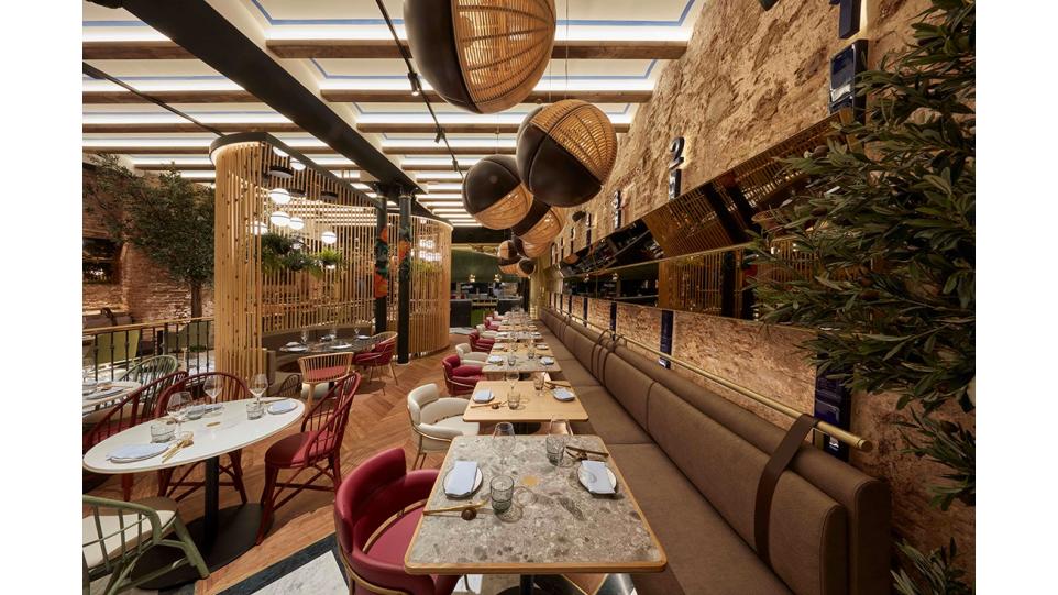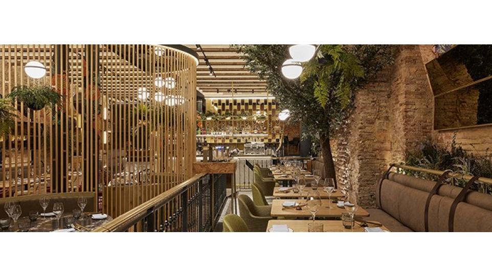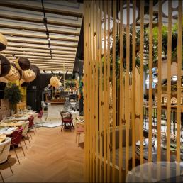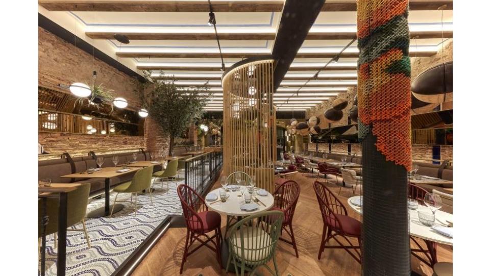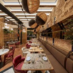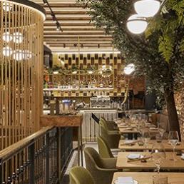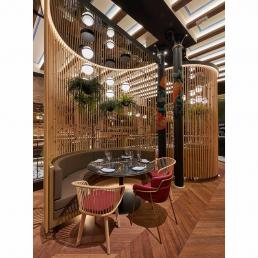 Авторам удалось максимально внедрить в интерьер натуральные материалы (дерево, бамбук, мрамор, керамику, песчаник) и другие элементы живой природы, первую очередь, зеленые декоративные растения. В главном зале ресторана Антонио Арола применил свой подвесной светильник «Palma». Дизайн его был вдохновлен висячими садами древности. Идея автора заключалась в том, чтобы достичь как можно более тесного контакта света с зелеными растениями, как в природе. Антонио Арола совместил пальмовые ветви cо сферическими рассеивателями.