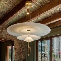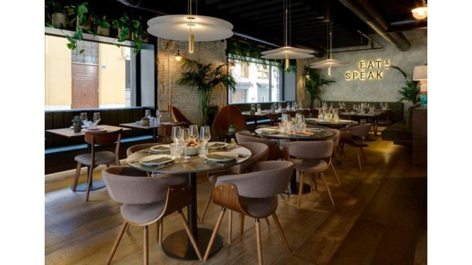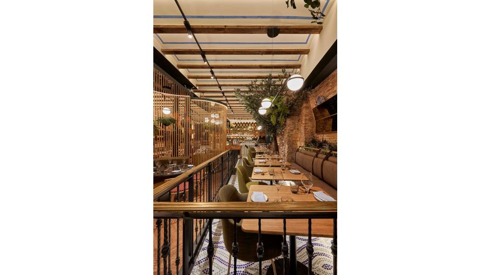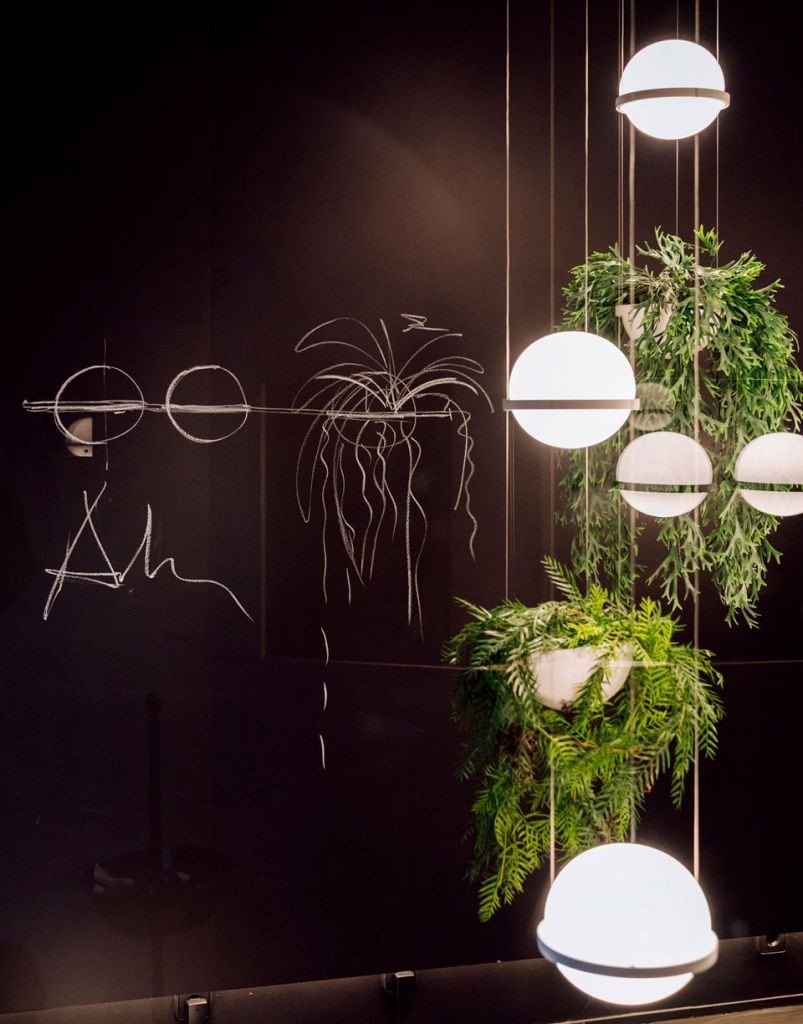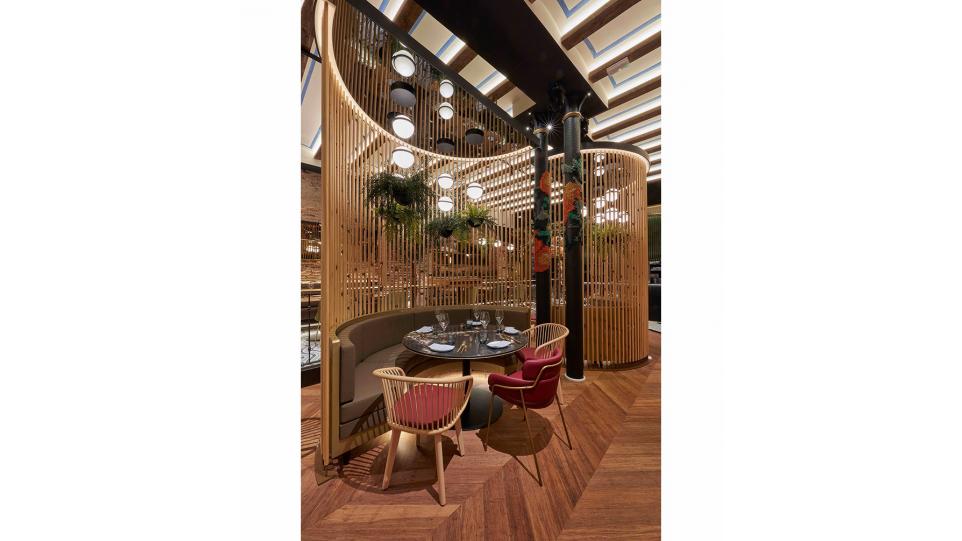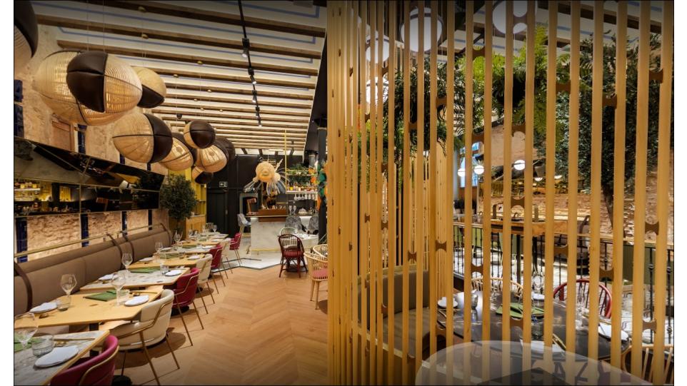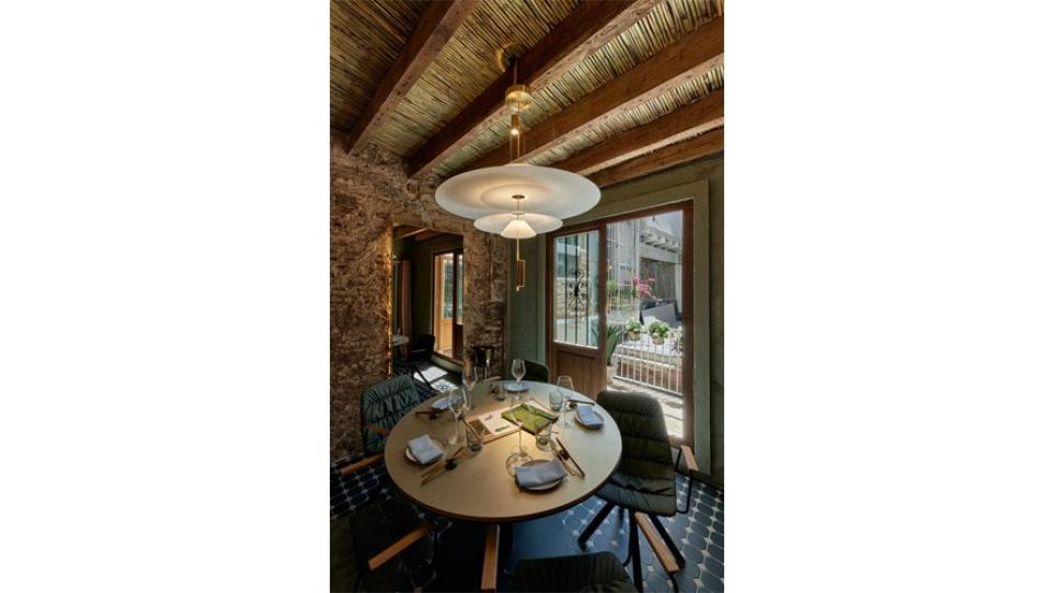 Авторам удалось максимально внедрить в интерьер натуральные материалы (дерево, бамбук, мрамор, керамику, песчаник) и другие элементы живой природы, первую очередь, зеленые декоративные растения. В главном зале ресторана Антонио Арола применил свой подвесной светильник «Palma». Дизайн его был вдохновлен висячими садами древности. Идея автора заключалась в том, чтобы достичь как можно более тесного контакта света с зелеными растениями, как в природе. Антонио Арола совместил пальмовые ветви cо сферическими рассеивателями.