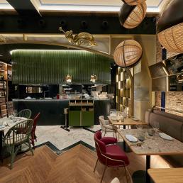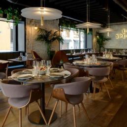 Элегантный светильник „Flamingo“ этого дизайнера установлен над столами в нескольких уютных кабинетах ресторана.