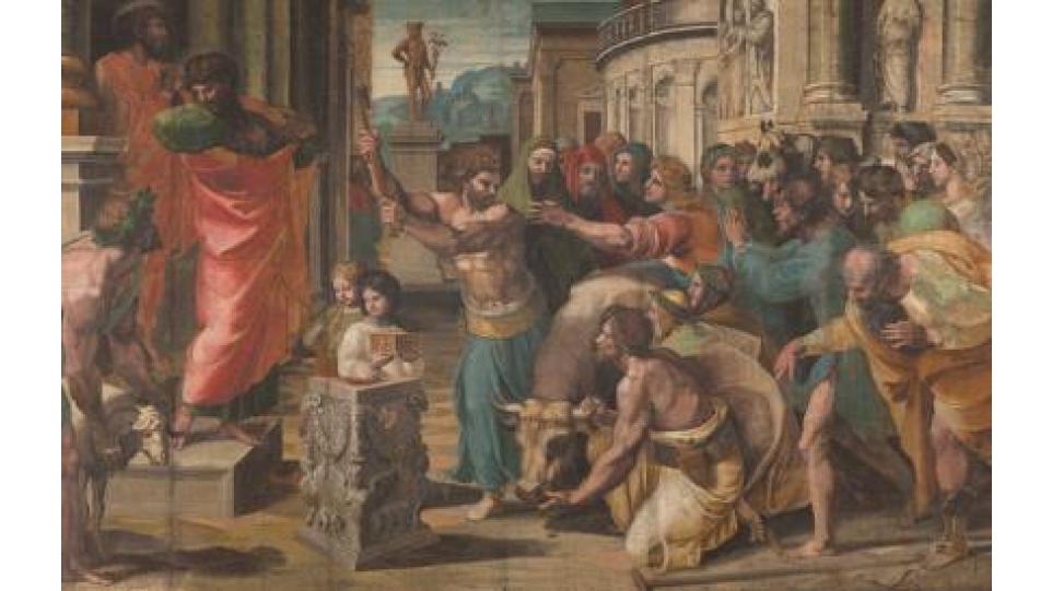 Рафаэль Санти – Обращение проконсула Сергия Павла (1515-16). (Се?ргий Па?вел — проконсул Кипра во времена правления императора Клавдия (I век н. э.), персонаж новозаветной книги Деяний святых апостолов.)