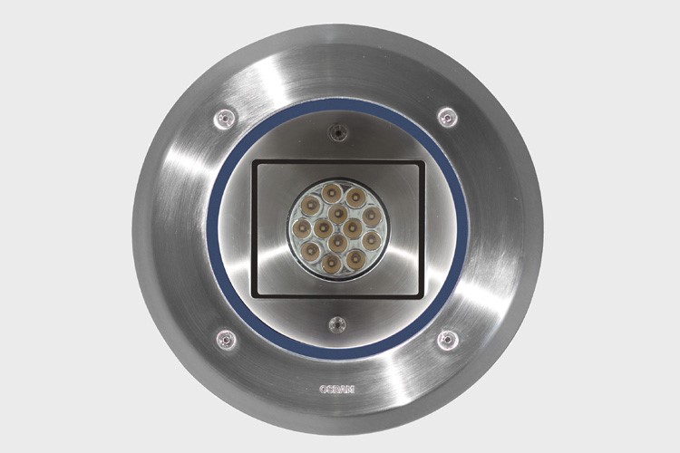 Для освещения колоннады использованы светильники модели «Aqualed», встроенные в каменное покрытие на входе.