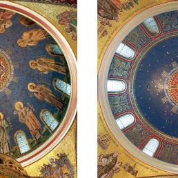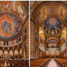 Немецкая фирма August Wagner получила контракт на установку мозаик. Компания открыла магазин в Сент-Луисе, став Ravenna Mosaic Company. Следуя замыслу мастеров, Пол Хейдак взялся за красные и золотые конструкции галерей трансепта, затем завершил Триумфальную арку и Арку творения, за которыми последовали паруса, подчеркивающие главный купол, и паруса Учителей Церкви, окружающие купол святилища.