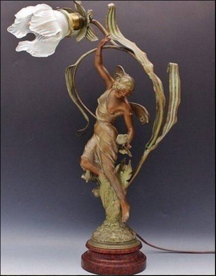 Этот изящнейший светильник французского происхождения - наглядный пример стиля модерн (Art Nuveau) с его гармоничным сочетанием гибких линий (стеклянный бутон, . листва и фигура женщины в полупрозрачном одеянии.. Вся композиция надежно уравновешена и покоится на основании из красного дерева.