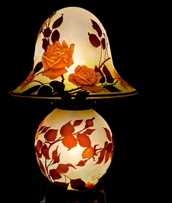 Одной из вершин стиля Ар Нуво в декоративно прикладном искусстве эксперты выделяют настольный светильник французской компании VERRE (1910) из выдувного опалового стекла с флоральным декором, нанесенным по запатентованной технологии невыцветающими красителми. Это- одна из лучших работ знаменитого ювелира и художника по стеклу – Rene Lalicue (Рене Лалик,1860-1945 ) – ярчайшего представителя стилей модерн АрНуво и АрДеко.