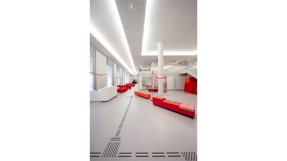 Для общего отраженного освещения служат линейные модульные светодиодные светильники «NauticProfil» фирмы FLASHAAR. Суммарная длина светящих линий – более 1100 м, они гармонично сочетаются с архитектурно-строительными элементами потолков.