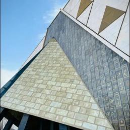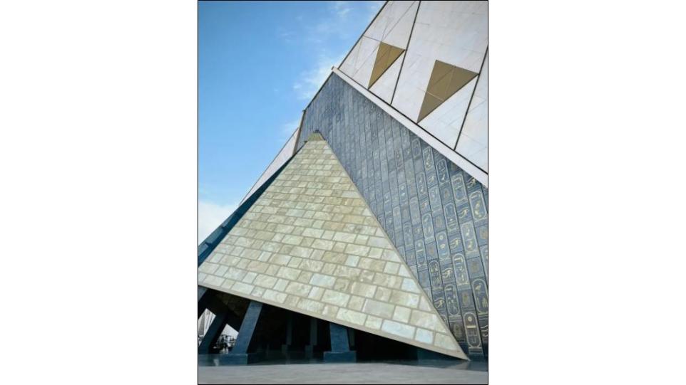 Центральным мотивом является постоянная отсылка к пирамидам Гизы: обзорные линии, окна и стеклянные поверхности обеспечивают вид на внешний мир, а дневной свет создает связь между историческим ландшафтом и экспонатами внутри