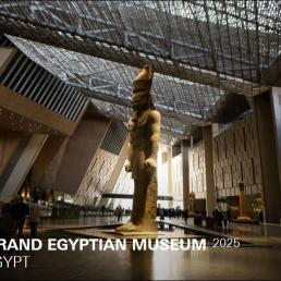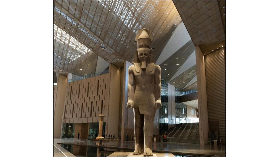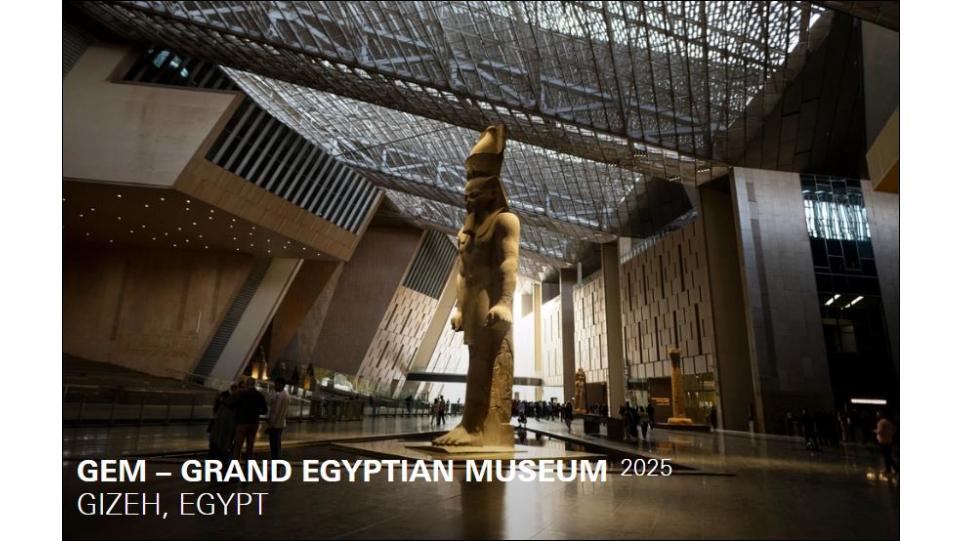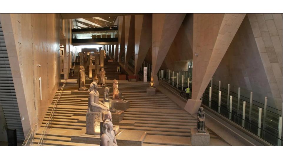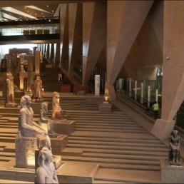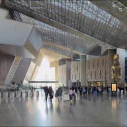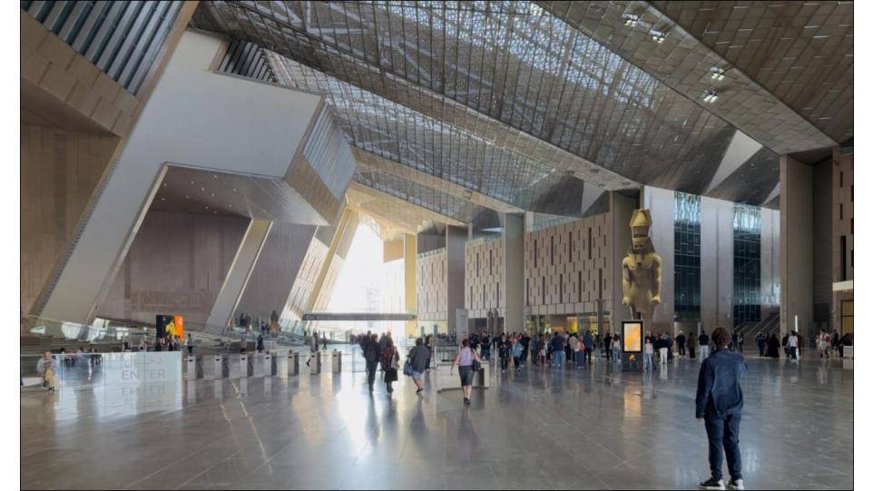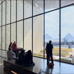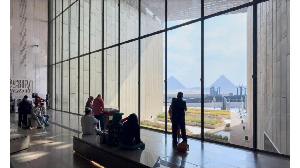 Центральным мотивом является постоянная отсылка к пирамидам Гизы: обзорные линии, окна и стеклянные поверхности обеспечивают вид на внешний мир, а дневной свет создает связь между историческим ландшафтом и экспонатами внутри.