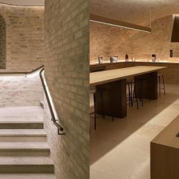 Каменная лестница ведет в современный, залитый тёплым светом винный погреб с деревянными столами, табуретами, бутылками и декоративными кирпичными стенами.Минималистичный по форме и архитектурный по выразительности, подвесной светильник L 120 излучает как в нижнюю, так и в верхнюю зоны пространства (на потолок). Обе компоненты излучения регулируются автономно.