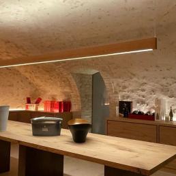 В дегустационном зале резиденции обновлённый L 120 с микропризменной оптикой обеспечивает изысканное освещение с низким уровнем бликов, сочетая комфорт и эффективность. Этот светильник подчёркивает спокойную элегантность помещения, тонко подчёркивая его материальность.