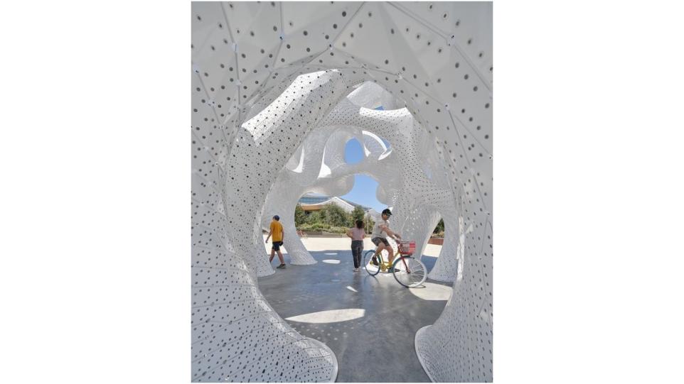 Эта ультратонкая самонесущая алюминиевая конструкция высотой 10 м с замысловатой складчатой структурой снабжена миниперфорацией, которая создает динамичную игру света и тени.