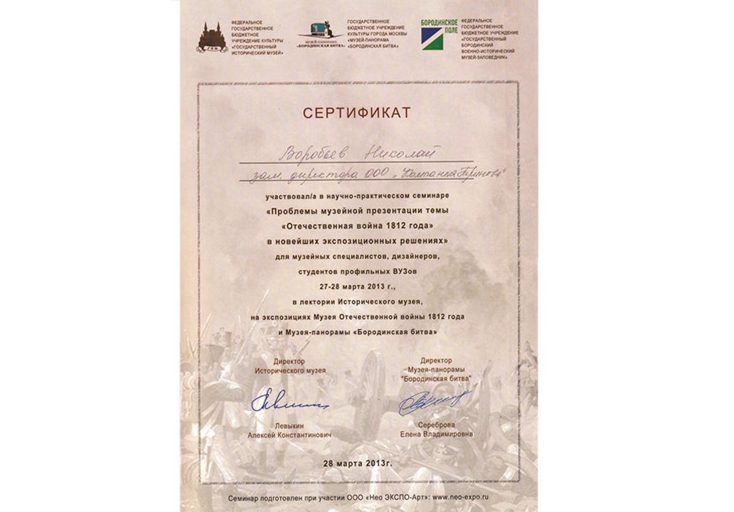 27-28 марта 2013 года компания ТРИНОВА приняла участие в научно – практическом семинаре “Проблемы музейной презентации темы “Отечественная война 1812 года” в новейших экспозиционных решениях”. Заместитель директора по развитию направления «Музейное и экспозиционное освещение» Николай Воробьев представил материалы реализованных выставочных проектов, а также презентационный фильм о компании ТРИНОВА и ее возможностях.