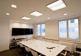 Главная задача – создание в помещении комфортного уровня освещенности, и необычного дизайна расположения осветительных приборов в зоне ресепшн, переговорных комнатах. Необходимо было отобразить на потолке необычное расположение осветительных приборов, задуманное архитекторами проекта. Использование светодиодной продукции позволило добиться нужного результата.