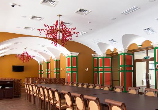 Для проведения банкетов в Конгресс-Отеле существует специальный банкетный зал. Он расположен в отдельно стоящем здании на территории отеля. Компания ЛЮКСФОРМ спроектировала и изготовила каскадную люстру и 13 бра из латунного литья, украшенных хрусталем. Латунные детали люстры и бра покрыты матовым никелем. В сочетании с хрусталем такое покрытие придет изделию уникальный внешний вид.